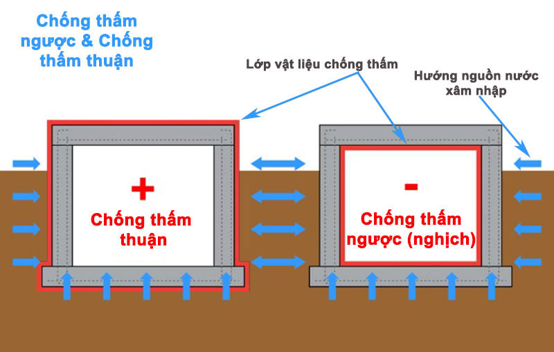 Chúng ta cũng có thể giải thích một cách đơn giản như sau: “Khi nước ngấm từ mặt bên ngoài tường vào thì ta sẽ chống thấm ở bên trong tường thì gọi là chống thấm ngược. Hoặc khi nước ngấm từ trong bể ra, ta sẽ chống thấm ở ngoài bể cũng gọi là chống thấm ngược”