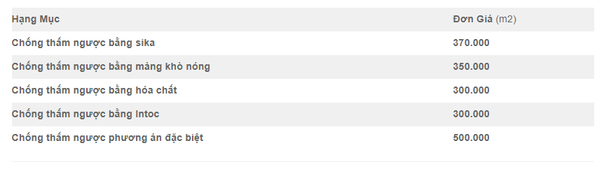 Tùy vị trí, vật liệu cũng như phương pháp thi công mà sẽ có báo giá khác nhau cho từng hạng mục.Dưới đây là bảng báo giá dịch vụ chống thấm ngược sơ bộ tại Thợ Hay quý khách có thể tham khảo. Báo giá thực tế dựa vào kết qua sau khảo sát.