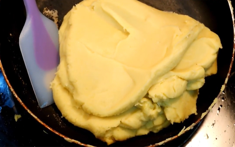 Đến khi đậu xanh đã quánh lại, cho vào phần dầu cuối cùng, sên đều đến khi đậu dẻo lại thành 1 khối là xong.